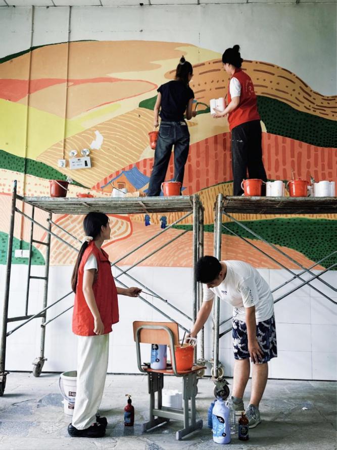 经过数日的紧张创作,三面墙绘作品终于圆满完成,墙绘的点缀不仅延伸了多功能厅的空间深度,更让观者仿佛置身于那片充满生机的田野之中,感受到了乡村振兴的勃勃生机。